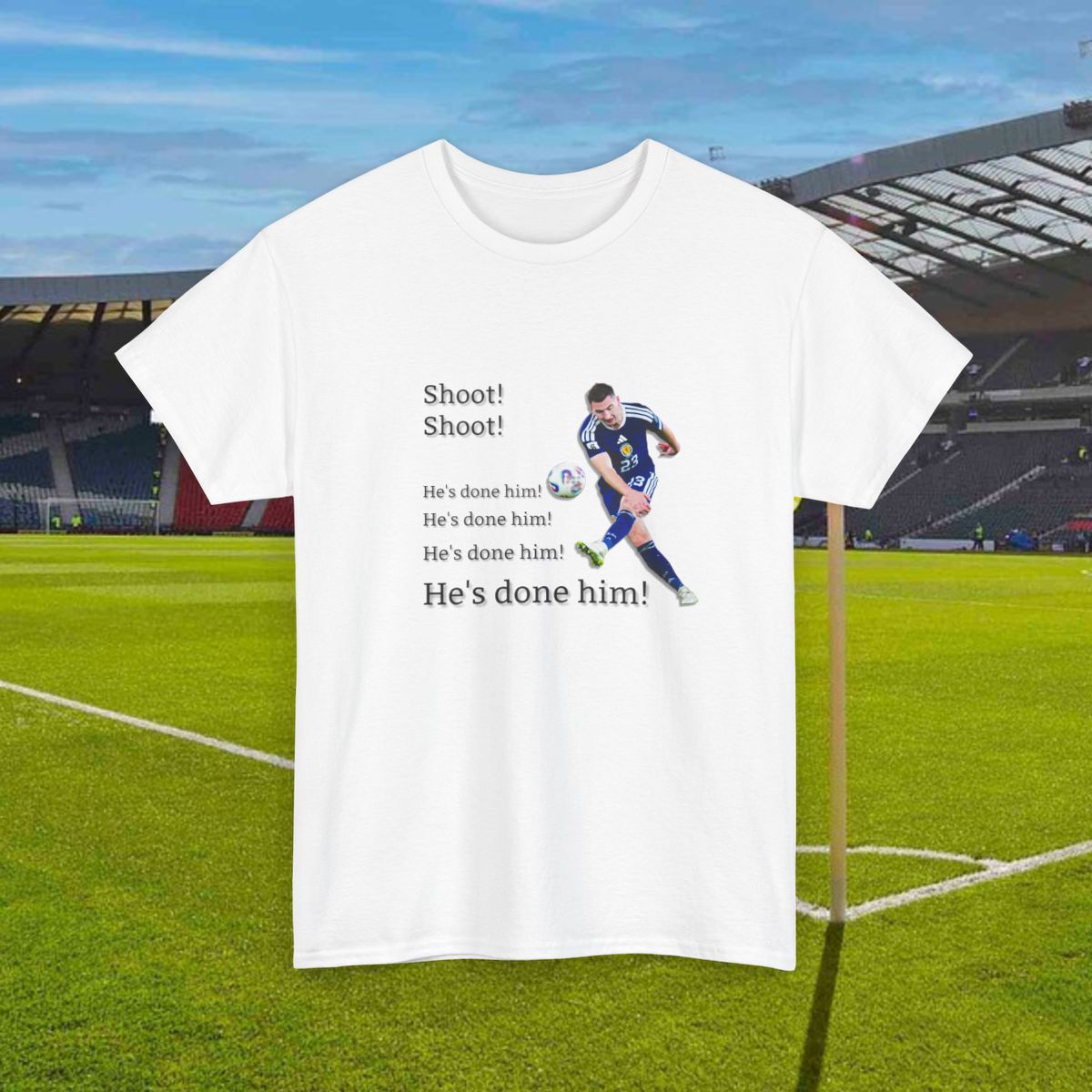 A soft cotton tee featuring a commentary inspired design in homage to Kenny McLean's iconic winner against Denmark to send us to the 2026 World Cup. Kenny McLean from the halfway line!