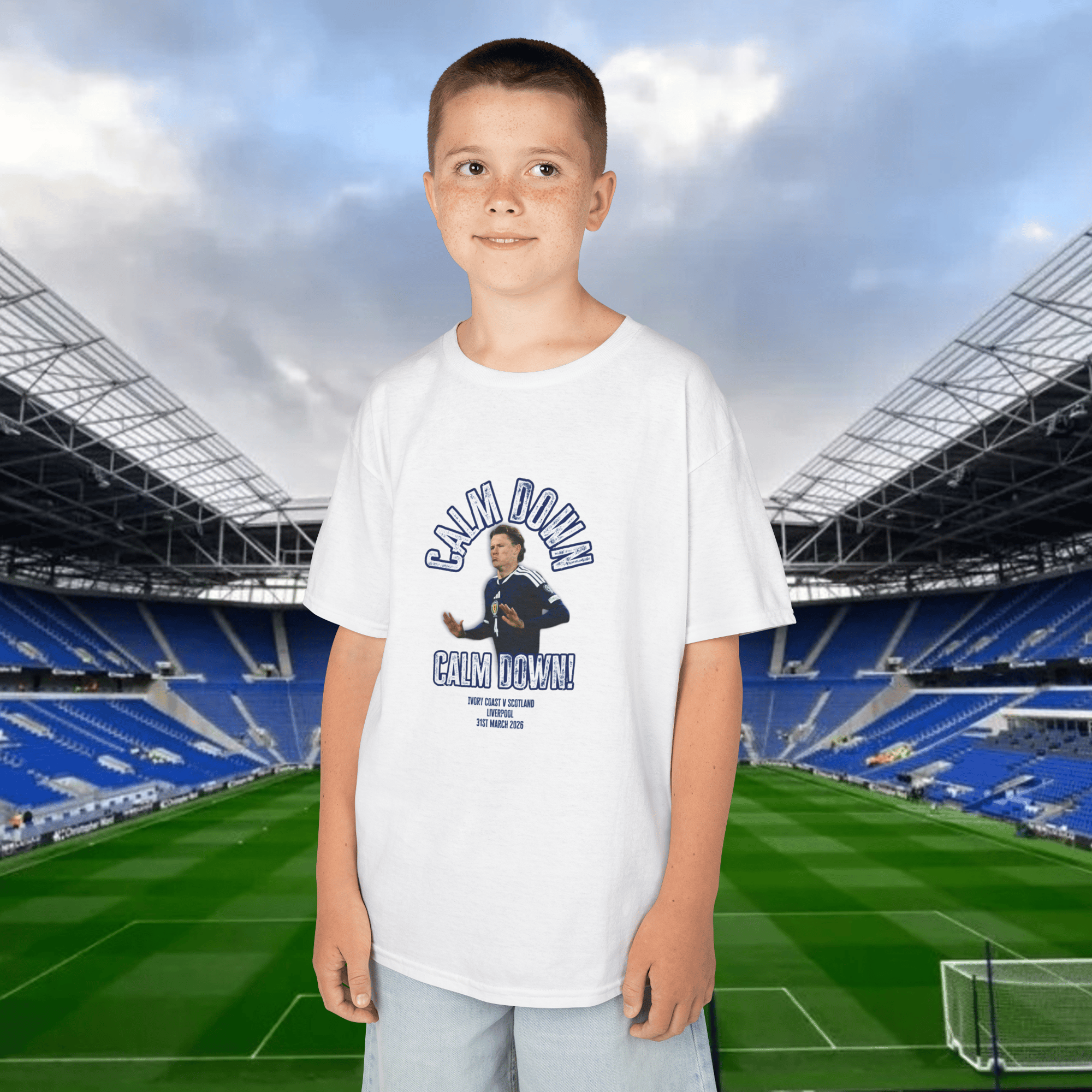 A soft cotton kids tee featuring a Scouse inspired design for Scotland's away friendly against Ivory Coast in Liverpool.